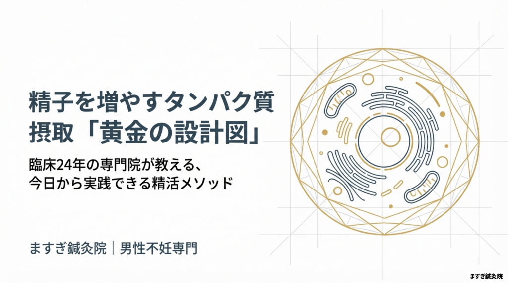 精子の材料となるのは、私たちが日々口にするタンパク質です。精子を安定して作り、その質を維持するためには、ただ量を摂るだけでなく「質」と「摂り方」が非常に重要になります。24年の臨床経験に基づき、今日から実践できるタンパク質摂取の黄金ルールを解説します。