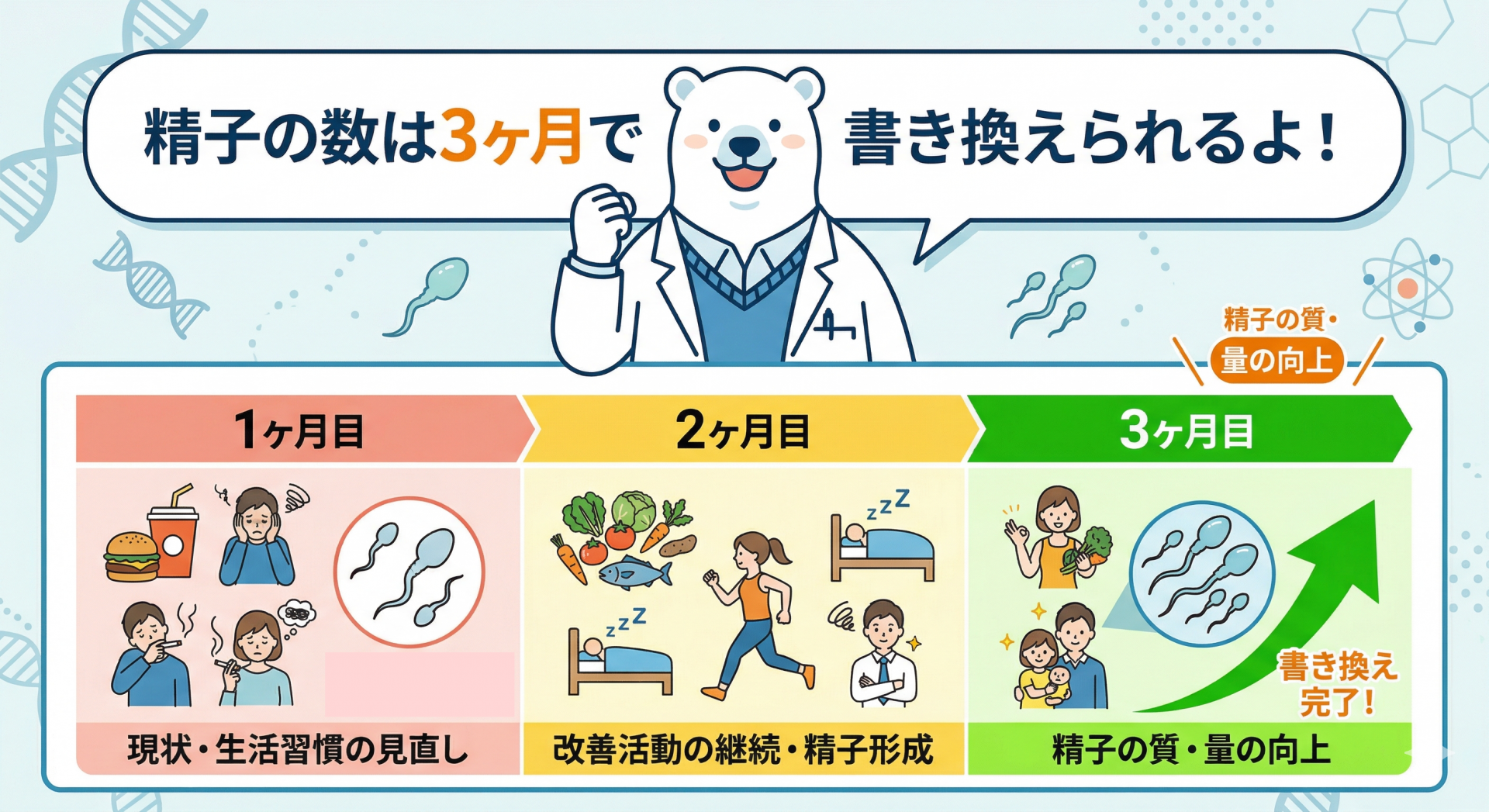 「精子の数が少ないのは、君の能力のせいじゃない。ただ、今の『工場の環境』が悪いだけなんだ。 お風呂上がりに精巣を冷やす『金冷法』をしたり、スマホを置いて目を休める時間を 分作るだけでも、工場はまた元気に稼働し始めるよ!僕たちと一緒に、最高鮮度の一粒を育てていこうね。」